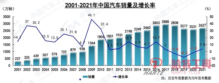 圖3 2001-2021年國內汽車銷量及增長率