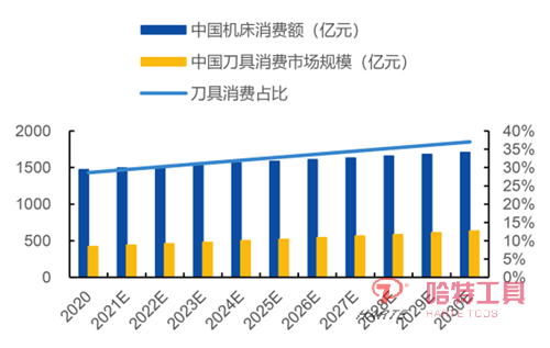 發達國家數控刀具與數控機床協調發展,刀具消費額約為機床消費額的50%左右,而國內由于機床總數控化率較低,刀具消費額占比較低。假設伴隨中國制造業轉型升級,2030年中國刀具消費在機床消費額占比有望達到37%,同時中國機床消費額以 1.5%年復合增長率增長,中國刀具市場規模有望在2030年達到631億元,2020至2030年復合增長率達4.14%。